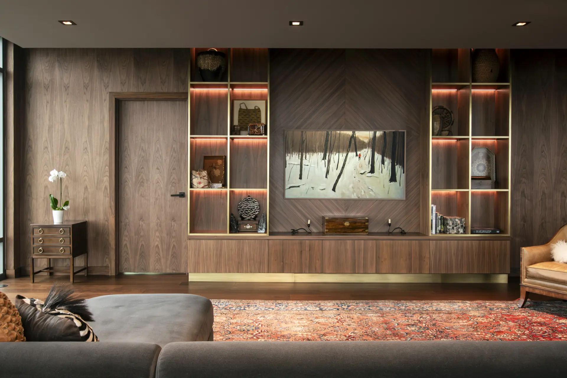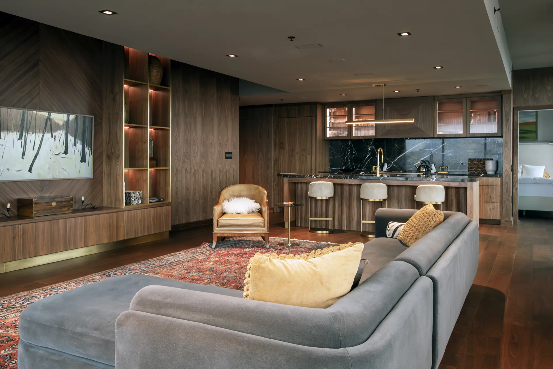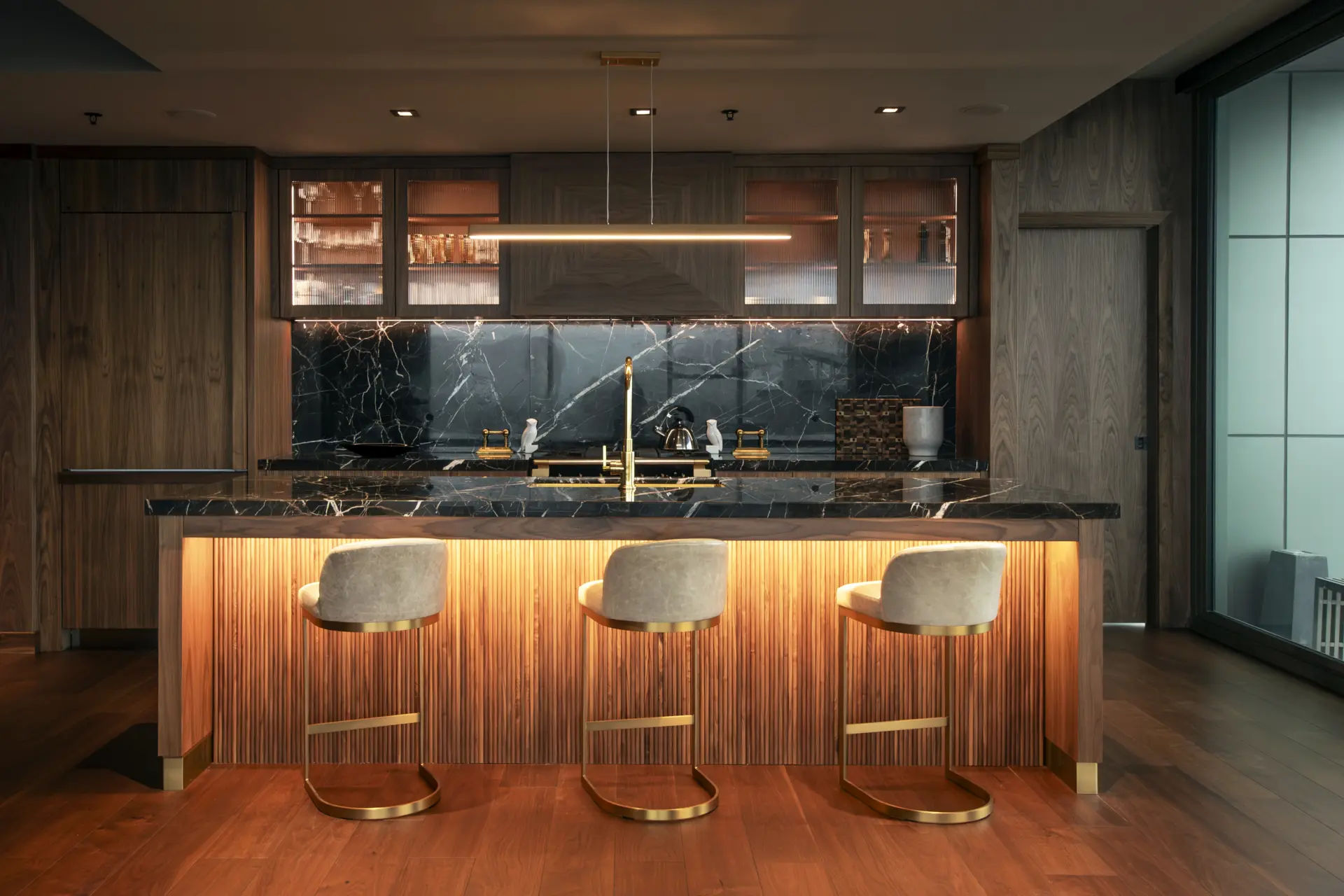 In this refined urban residence, cabinetry takes center stage as both architecture and art. Richly toned wood wraps the kitchen and living spaces in a seamless, tactile envelope, where reeded detailing along the island introduces a quiet rhythm and depth. Glass-front upper cabinets glow with warm backlighting, turning everyday storage into a curated display. The built-in millwork continues in the living area with illuminated shelving and balanced proportions that feel both modern and timeless.