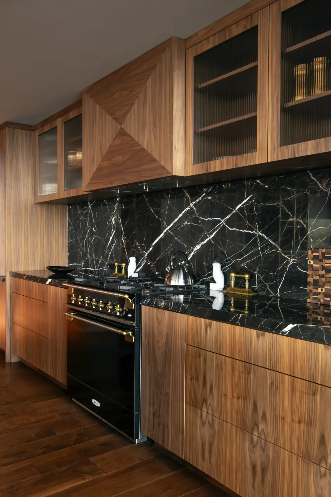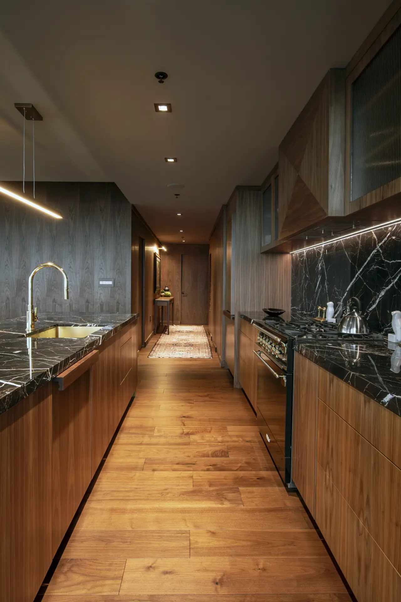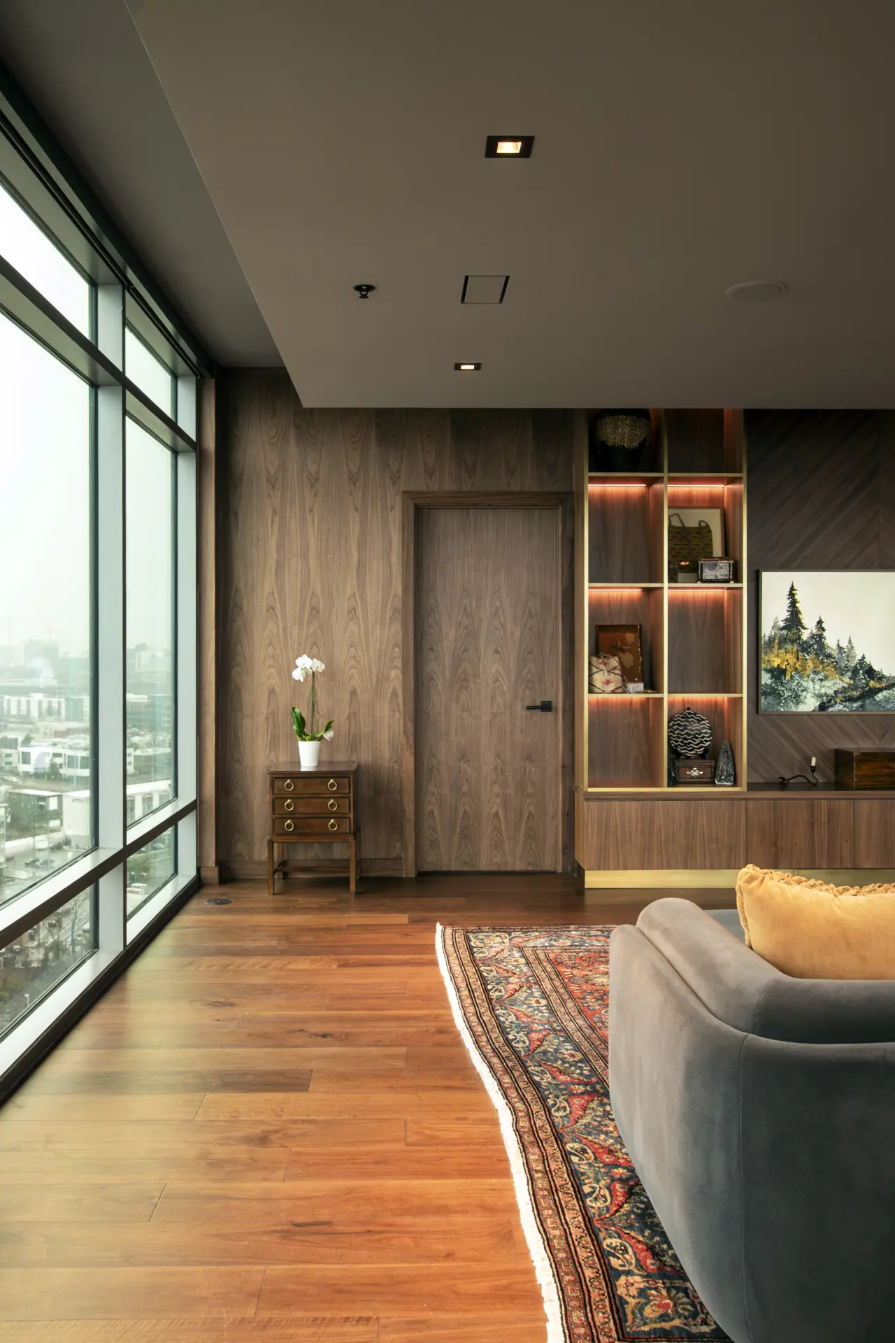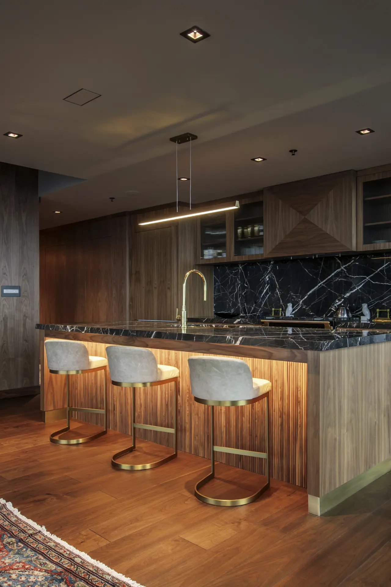 In this refined urban residence, cabinetry takes center stage as both architecture and art. Richly toned wood wraps the kitchen and living spaces in a seamless, tactile envelope, where reeded detailing along the island introduces a quiet rhythm and depth. Glass-front upper cabinets glow with warm backlighting, turning everyday storage into a curated display. The built-in millwork continues in the living area with illuminated shelving and balanced proportions that feel both modern and timeless.